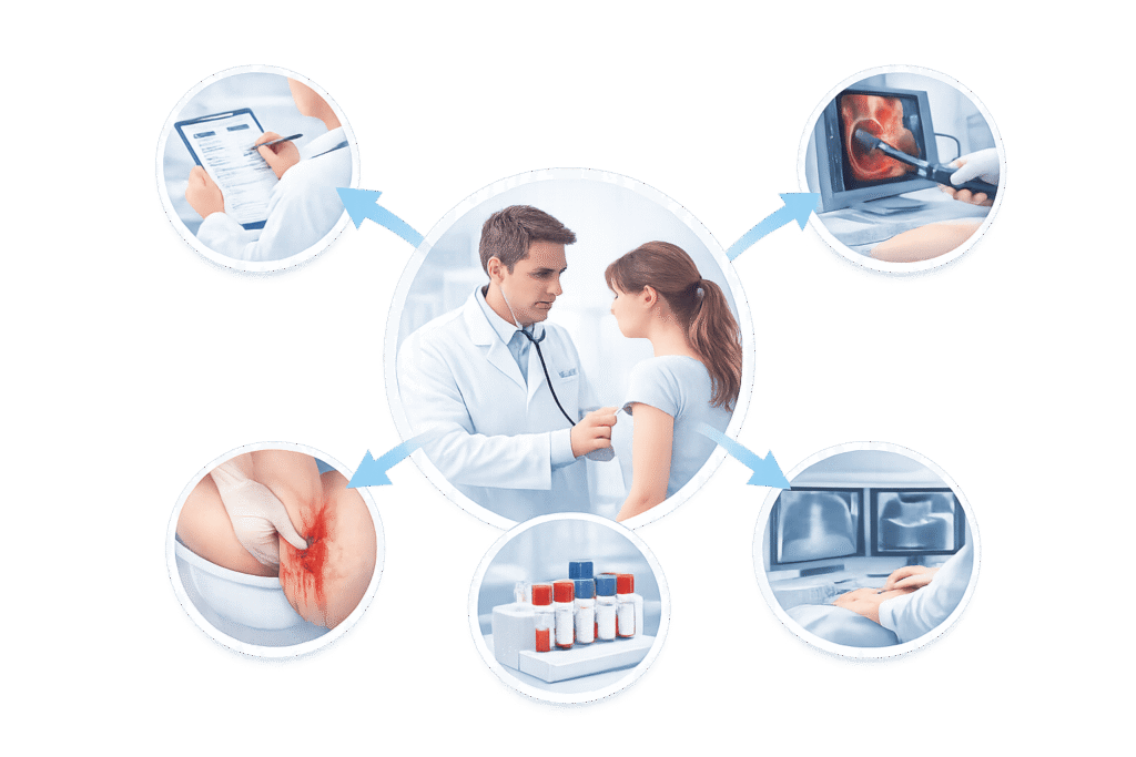 Diagnosis is based on clinical assessment and diagnostic investigations, which may include: