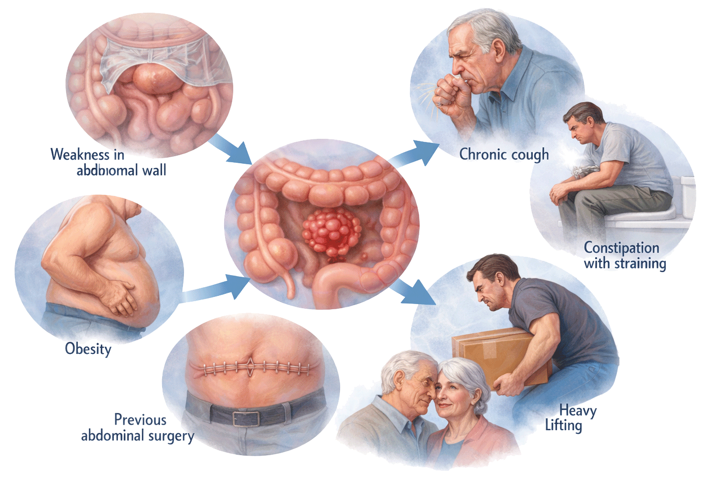 • Weakness in the abdominal wall (congenital or acquired)
