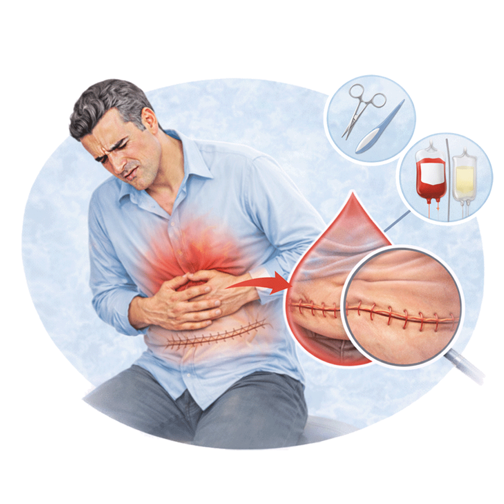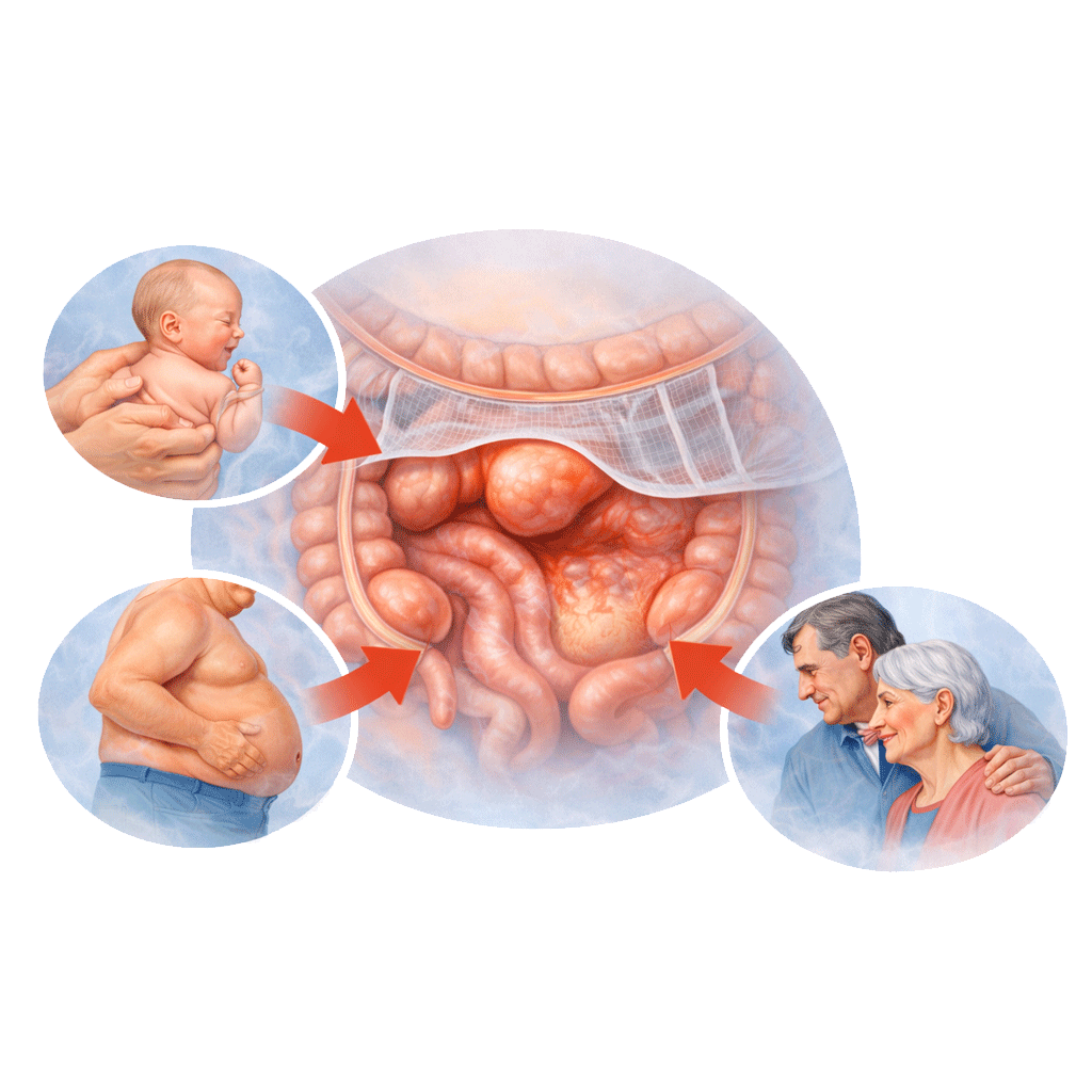An inguinal hernia occurs when abdominal contents (such as intestine or fatty tissue) protrude through a weakened area in the lower abdominal wall, typically in the groin region. It is one of the most common types of hernia and is seen more frequently in men.